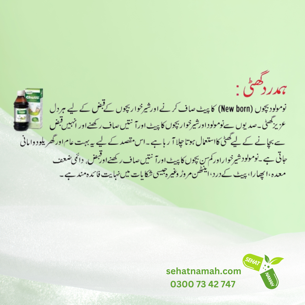 Hamdard Ghutti is a natural herbal remedy designed specifically for newborns and children. It provides an effective solution for common digestive disorders such as constipation, intestinal cramps, and colic pain. The unique formulation of selected herbs helps clear the bowels of newborns and relieves constipation in children. With ingredients that have been trusted for generations, Hamdard Ghutti helps address gastric problems and provides relief from symptoms like abdominal pain, bloating, and flatulence.