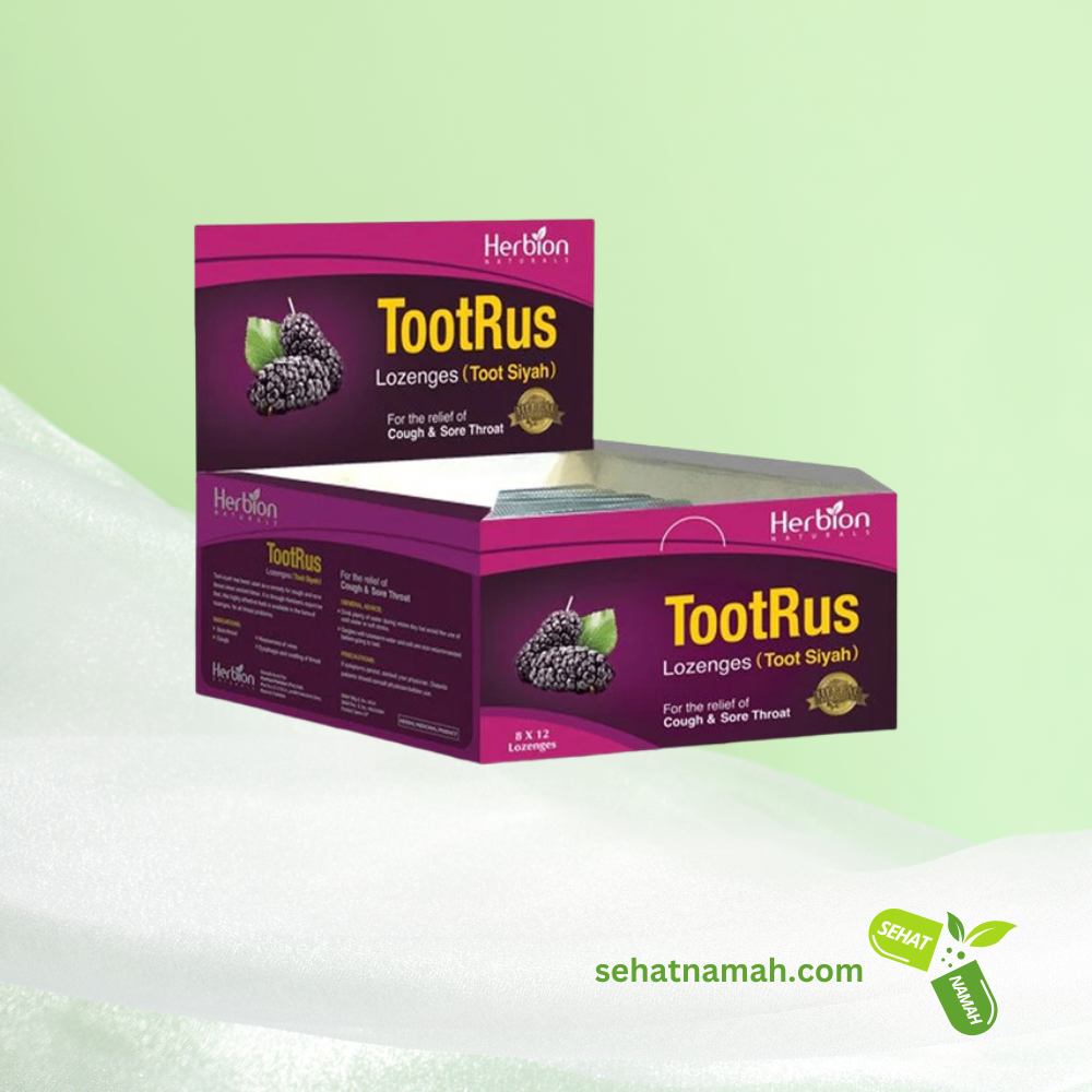 Herbion TootRus Lozenges are herbal lozenges made from Morus nigra (Black Mulberry), known for its traditional use in soothing sore throats, reducing coughs, and calming throat irritation. TootRus offers antiseptic and cooling properties, providing quick relief from various cough-related symptoms. This is the first time that Toot Siah has been introduced in lozenge form in Pakistan, offering convenience and effectiveness.