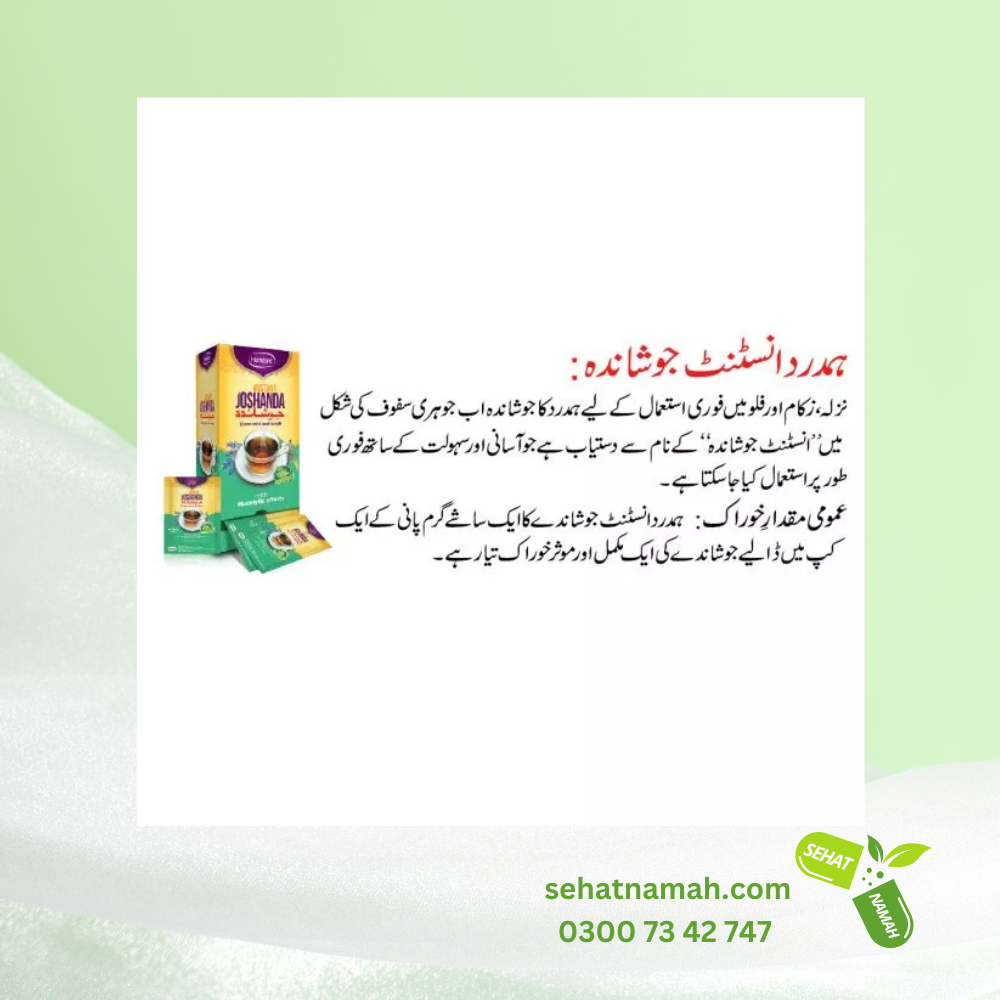 Instant Joshanda Hamdard is listed on SehatNamah.com website for sale, and SehatNamh.com is the delivery service provider/partner to deliver the required product or medicine. Always seek guidance from licensed healthcare professionals for specific health concerns. The information provided on SehatNamah.com is intended for general informational purposes only. SehatNamah.com is not the manufacturer of the products listed on our platform but just a deliver service / delivery partner for the required product or medicine. While we strive to ensure the accuracy of the product details presented, manufacturers may update or alter their product formulations, packaging, or related materials. As such, the actual product information may vary from what is displayed on our website.