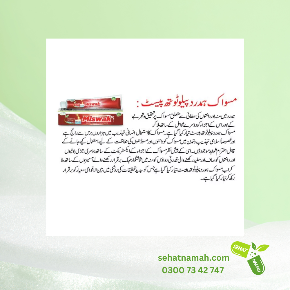 Miswak Peelu Toothpaste – Hamdard is listed on SehatNamah.com website for sale, and SehatNamh.com is the delivery service provider/partner to deliver the required product or medicine. Always seek guidance from licensed healthcare professionals for specific health concerns. The information provided on SehatNamah.com is intended for general informational purposes only. SehatNamah.com is not the manufacturer of the products listed on our platform but just a deliver service / delivery partner for the required product or medicine. While we strive to ensure the accuracy of the product details presented, manufacturers may update or alter their product formulations, packaging, or related materials. As such, the actual product information may vary from what is displayed on our website.