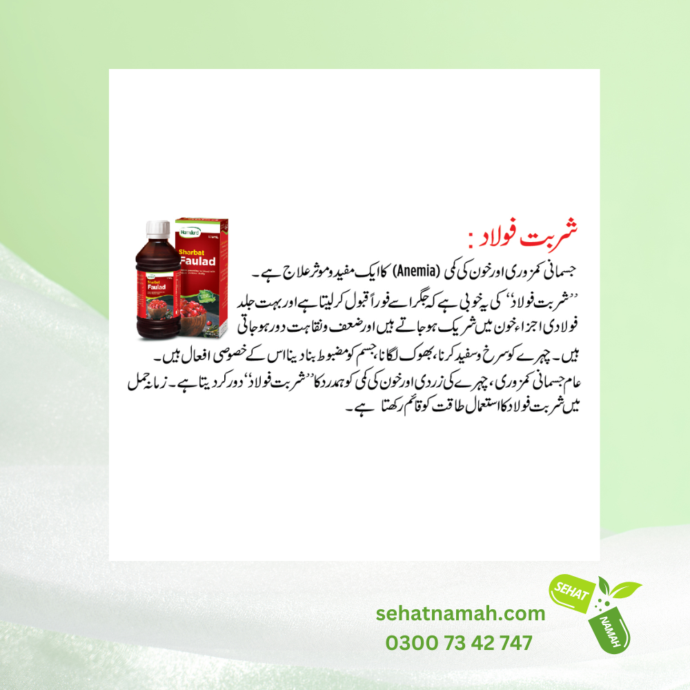 Sharbat Faulad – Hamdard is listed on SehatNamah.com website for sale, and SehatNamh.com is the delivery service provider/partner to deliver the required product or medicine. Always seek guidance from licensed healthcare professionals for specific health concerns. The information provided on SehatNamah.com is intended for general informational purposes only. SehatNamah.com is not the manufacturer of the products listed on our platform but just a deliver service / delivery partner for the required product or medicine. While we strive to ensure the accuracy of the product details presented, manufacturers may update or alter their product formulations, packaging, or related materials. As such, the actual product information may vary from what is displayed on our website.